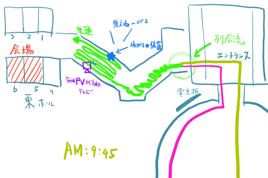 僕は黄色い列に並んでたんですが、ピンクの列がさらにその前に出来てたっぽいです。(恐らく徹夜列)それを合わせるとすでに1000人以上の人が並んでた事になります。 ・・・・・・始発で来たのになんじゃこりゃ( ̄△ ̄;)